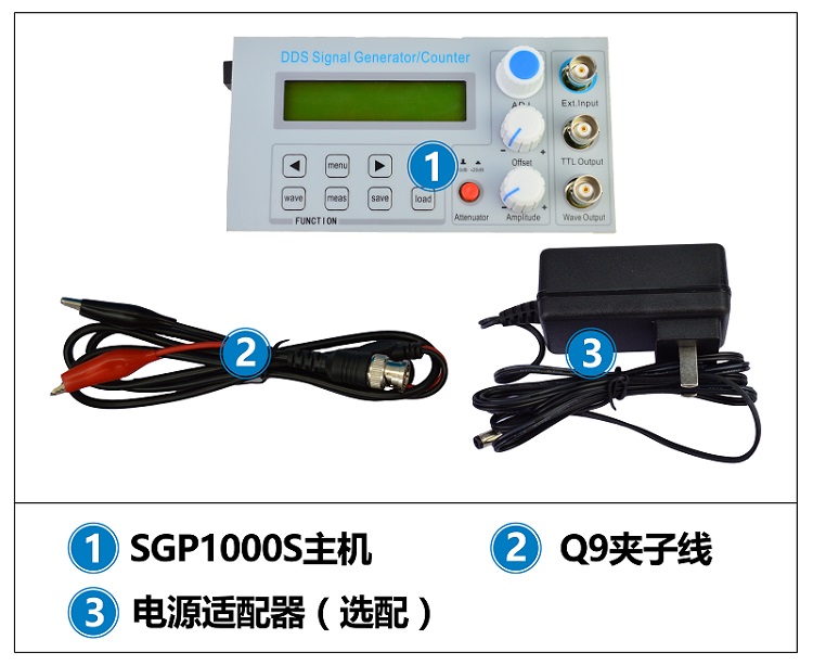 SGP1000S系列是基于直接数字合成技术(DDS)的信号发生器,采用FPGA设计,DC9V-DC36V宽电压电源供电,能够输出正弦,方波(占空比可以1%-99%调节),三角波以及锯齿波等多种函数波形,最大有效输出超越10Vpp,频率从0.01Hz-2MHz(也可选5MHz、8MHz、10MHz),分辨率为10mHz,同时具有TTL同步输出和具有计数器、60MHz频率计等多种功能于一体。具有使用方便,信号稳定度高,输出信号能够调节幅度和直流偏置,同时还具有扫频功能,支持线性扫描、对数扫描两种扫描方式,能够任意设定扫描频率范围以及扫描时间。是电子爱好者、实验室、生产线及教学、科研的理想设备,同时也可作为工业设备的配套模块使用。